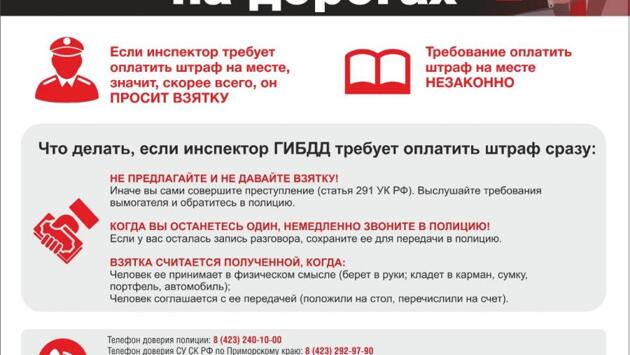 Телефон доверия полиции: 8 (423) 240-10-00, СУ СК РФ по Приморскому краю: 8 (423) 292-97-90, прокуратуры Приморского края: 8 (423) 240-62-04, Федеральной службы безопасности РФ: 8 (495) 224-22-22, линия «Остановим коррупцию» Следственного комитета РФ: 8 (800) 100-12-60.