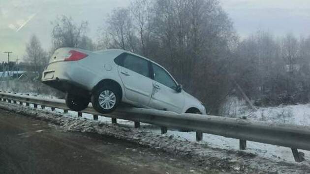 Днем 14 декабря в Кирово-Чепецке произошло неординарное ДТП. Судя по всему, после столкновения на отбойнике повис "Датсун". На правом борту легковушки видны следы повреждений. Однако о втором участнике аварии ничего не сообщается.