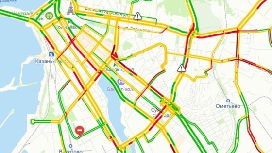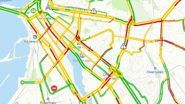 Согласно данным, сложная дорожная ситуация на Лево-Булачной улице, Пушкина, Щербаковском переулке. Стоят улицы Туфана Минуллина, Роща Фрунзе, Тихомирова, Назарбаева, Вишневского, Ершова и другие улицы.