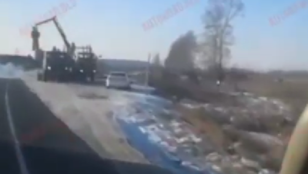 На кадрах запечатлён большегруз, перевёрнутый на бок, а также древесина, разбросанная рядом. На другом видео, появившемся в социальных сетях, видно, как груз лесовоза перекладывают в другую машину.