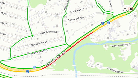 Движение на дорожной полосе, ведущей из Куйбышевского района Новокузнецка в Центральный, затруднено из-за ДТП. Загруженность движения отмечена в электронных картах города.