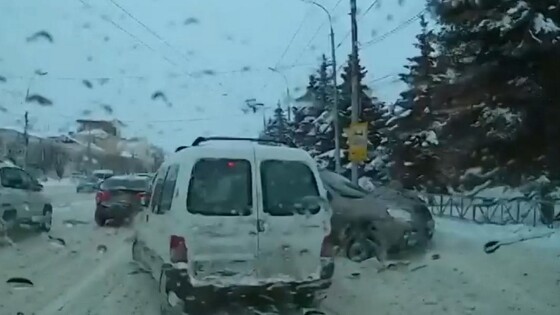 Три машины столкнулись на Первомайском проспекте, рядом с перекрёстком с улицей Маяковского. На записи видно, как автомобиль, едущий со стороны площади Ленина в правом ряду, ускоряясь, попадает в снежный отвал на обочине и от этого разворачивается. В него врезается едущая рядом машина, а в ту — двигавшееся за ней авто автора ролика.