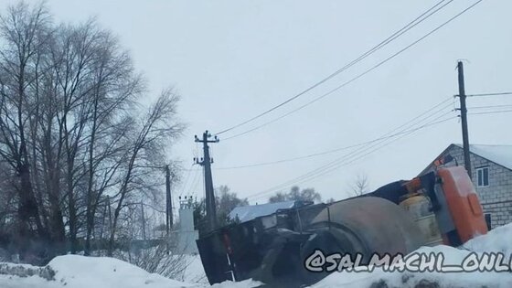 Под Казанью на обочину дороги опрокинулся грузовик с бетономешалкой. Фото появилось в соцсети.
