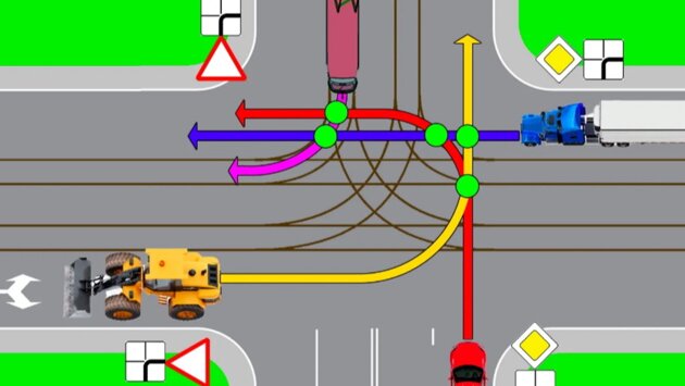 Ситуация, показанная на вышеупомянутой картинке, разрешится следующим образом: первым проедет грузовик по главной дороге без помех справа. Далее это сделает легковая машина, которая освободится от помех справа. Следом начинают движение автолюбители на второстепенном отрезке. Так как траектории погрузчика и трамвая не будут пересекаться, они одновременно проедут данный участок.