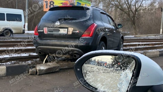 О происшествии сообщили очевидцы в группе “Автокадр_46”. По словам подписчиков, автомобиль двигался в сторону областного центра и вылетел на трамвайные пути. По данным пресс-службы УМВД России по Курской области, в ДТП никто не пострадал. Автомобиль получил механические повреждения. Фото: “Автокадр_46”