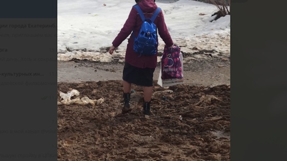 На кадрах отчетливо видно, как обитатели "Просторов", пачкая одежду, а порой и с риском для здоровья пытаются форсировать изрядных размеров грязевое болото, раскинувшееся в пешеходной зоне между ЖК и берегом Исети.