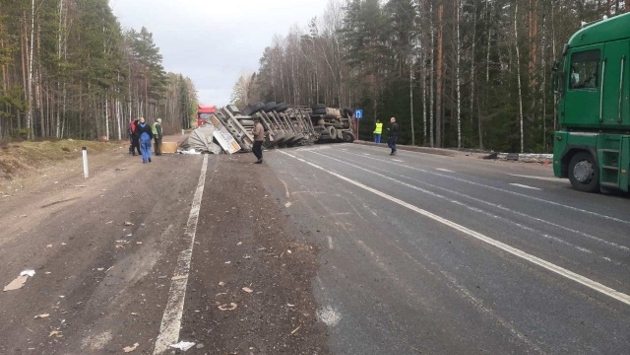 САНКТ-ПЕТЕРБУРГ, 8 апреля. /ТАСС/. Грузовик с прицепом опрокинулся на 173-м километре федеральной трассы "Скандинавия" в Ленинградской области и перекрыл движение. Об этом сообщили журналистам в четверг в учреждении "Упрдор Северо-Запад".