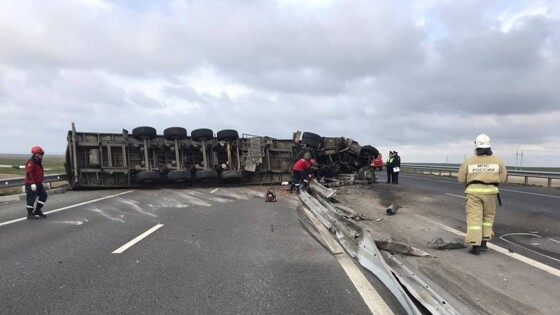 Движение на крымской трассе «Таврида» в сторону Керчи остановлено из-за перевернувшегося грузовика, сообщает пресс-служба МВД по Республике Крым. Авария произошла на 82-м километре. Со слов водителя, ДТП произошло вследствие взрыва одного из колес грузовика. В результате ДТП никто не пострадал. По данным МВД, для водителей, следующих в сторону Керчи, организован объезд места ДТП через поселок Насыпное и город Феодосию.