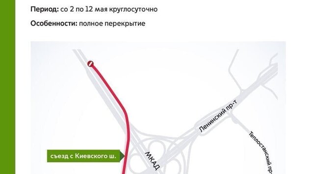 "С 2 по 12 мая закроют один из съездов с Киевского шоссе при движении в центр на внутреннюю сторону МКАД. Перекрытие движения связано с проведением работ по ремонту асфальта на транспортной развязке", - говорится в сообщении.