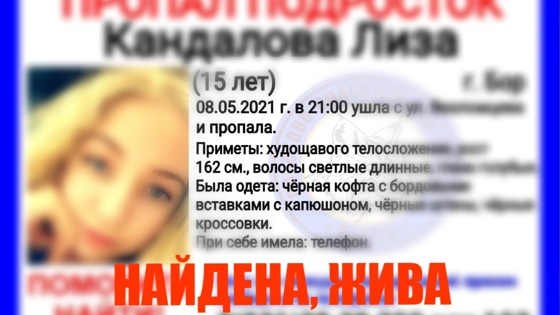 15-летняя Лиза Кандалова найдена в городе Бор Нижегородской области 9 мая. Об этом сообщил поисково-спасательный центр «Рысь». «Найдена. Жива», — сообщили волонтёры. Напомним, девочка-подросток пропала вечером 8 мая. Где всё это время находилась школьница, неизвестно. Еще новости по теме 15-летняя девочка-инвалид пропала в Сеченовском районе 9-летняя девочка пропала в Выксе в День космонавтики 14-летняя девочка пропала в Дзержинске