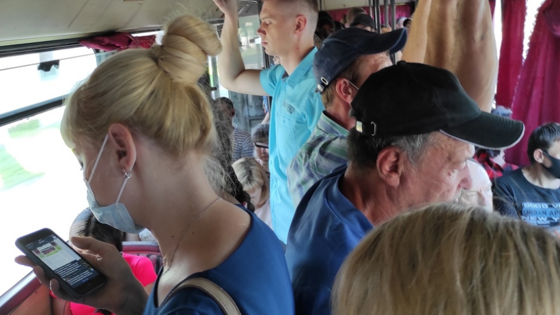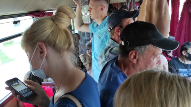 На кадрах ролика видно, что водитель во время движения пользуется мобильным телефоном без гарнитуры. Судя по фото, которое сделал автор публикации, в салоне много людей, они стоят в проходе между сиденьями. При этом практически у каждого из них отсутствует медицинская маска.