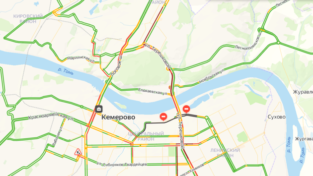 Согласно данным сервиса "Яндекс.пробки", в 17:30 загруженность кемеровских дорог составила восемь баллов. В серьезную пробку можно попасть на улице Терешковой и проспекте Кузнецком.