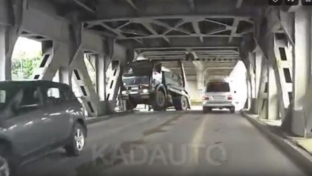 В Калининграде на двухъярусном мосту подпрыгнул мусоровоз
