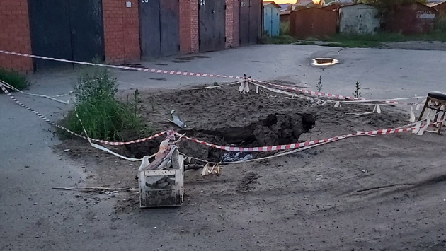 В тюменском селе возле детской площадки провалился асфальт. Зарыть котлован не могут больше года