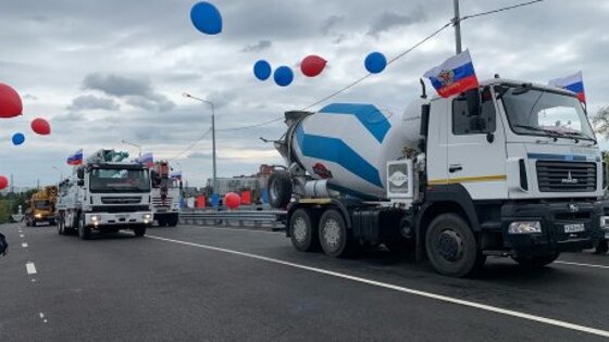 И вот настал торжественный момент: диск со словами «Проезд закрыт» перевернулся и превратился в знак «Проезд открыт», а затем по новому мосту двинулись машины-гиганты в окружении разноцветных воздушных шаров.
