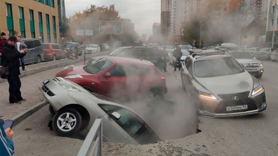 Инцидент произошел неподалеку от бизнес-центра «На Фрунзе» по адресу: улица Фрунзе, дом 80. Разлом асфальта оказался настолько масштабным, что сразу две машины ушли под землю, а третья оказалась повисшей на краю ямы.