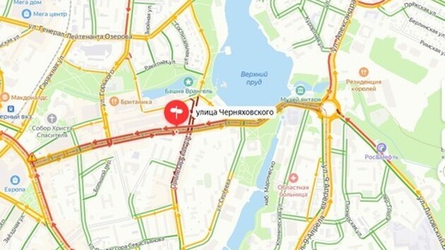 Движение также затруднено на протяжении всей улицы Черняховского и Ленинском проспекте. Небольшие заторы образовались на 9 Апреля и Невского.