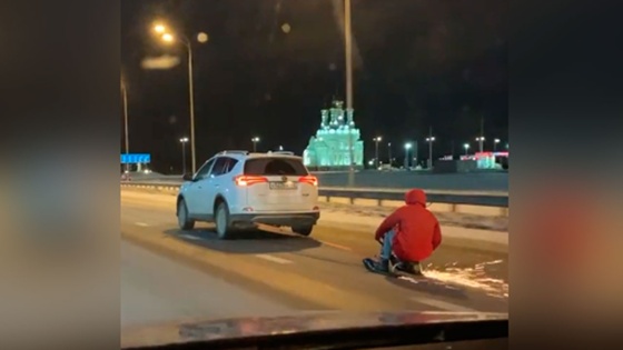 В Сети опубликовали кадры экстремальной езды человека по дороге на снегокате, который был привязан к машине. Отмечается, что автомобиль двигался по трассе со скоростью 90 километров в час. Инцидент произошел в Воронеже.