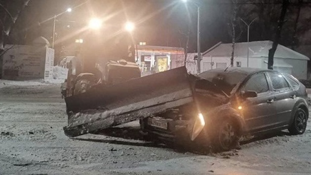 Фото странного ДТП, в котором спецтехника расплющила переднюю часть автомобиля очевидцы опубликовали в паблике «Регион-36 Воронеж».