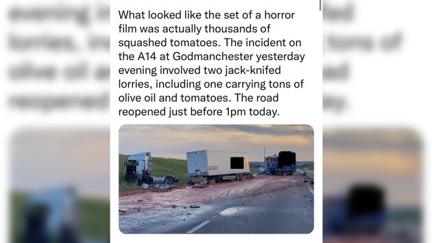 Кому-то покажется, что это море крови. Но не торопитесь нервничать, это всего лишь томатная паста, которая растеклась по трассе из-за того, что два транспортных средства врезались друг в друга - в одном кари, в другом оливковое масло и томаты - идеальное сочетание. Случай произошёл в Великобритании.