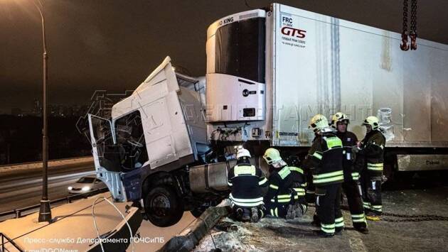 Спасатели вытащили человека из кабины свисающей с моста на МКАД фуры