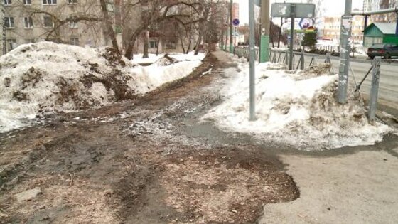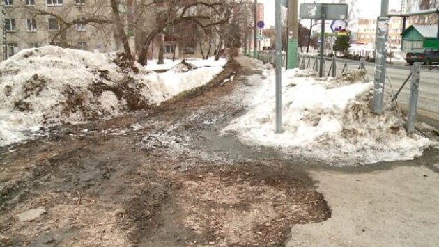 Чем ближе к светофору на улице Захарова, тем сильнее заметны изъяны. У примыкания к улице Космодемьянской тротуар уничтожен полностью. Наполовину засыпан замерзшим снегом, а далее - перекопанный грунт и следы тяжелых машин.