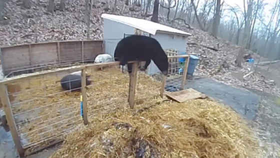 На кадрах, снятых камерой наблюдения, видно, что черный медведь перелез через невысокий забор и забрался в загон, где сидели две свиньи. Он начал приставать к более крупной свинье, которую зовут Мэри, но та оттолкнула хищника и ретировалась в угол.
