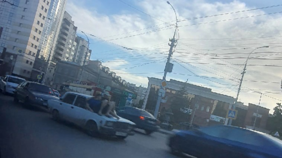 Очевидец запечатлел движущийся подороге автомобиль ВАЗ-2107, накапоте которого сидят двое юношей.