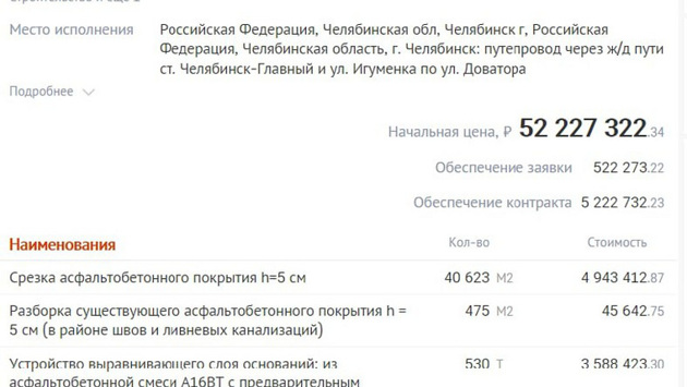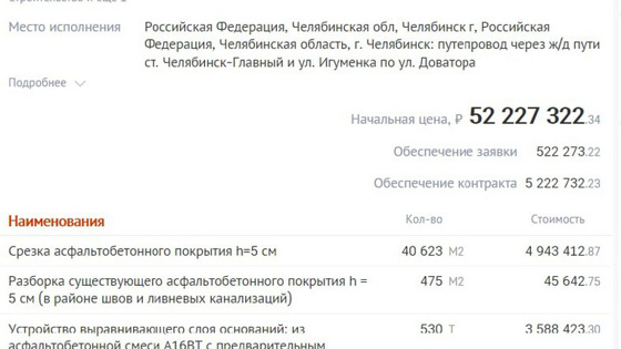 «Выполнение работ по ремонту проезжей части путепровода через ж/д пути станции Челябинск-Главный и улицы Игуменка до улицы Доватора стартует с начальной ценой 52 миллиона 227 тысяч 322 рубля», — говорится в документах электронного аукциона.