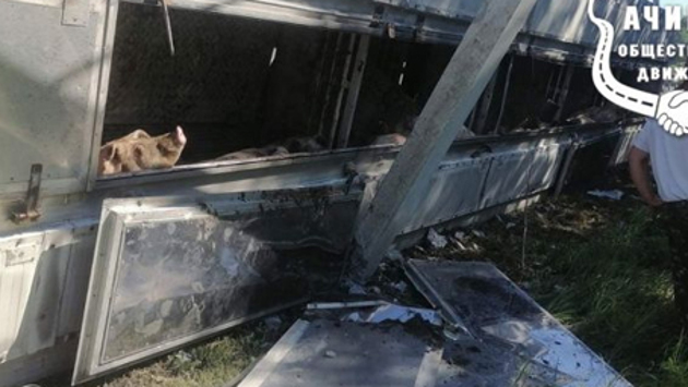 На трассе в Красноярском крае опрокинулся грузовик со свиньями