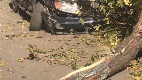 В крупном кузбасском городе автомобилист улетел на тротуар и повалил дерево. Его машина получила критический урон.