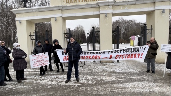 Первыми у входа в парк в Горроще бросались в глаза люди с огромным плакатом-растяжкой - призыв пересмотреть регламенты "Есенинской Руси" и отправить в отставку приложившего к созданию этого места зампреда ВООПИиК Игоря Кочеткова бросались в глаза издалека. Другие участники держали плакаты поменьше - но суть требований на них была выражена та же.