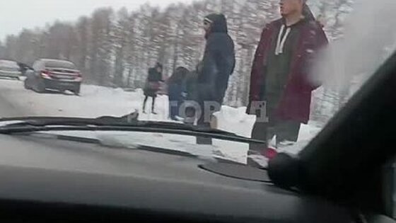 На кадрах видно маршрутку, которая вылетела с трассы на обочину и наехала на сугроб.