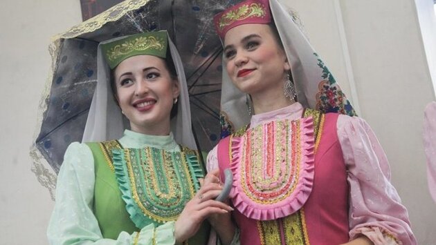 Примерно то же самое мы видим сегодня на ивентах, посвященных возвращению национальной культуры. Например, на летнем фестивале "Милли кием" дамы тоже дополняют вполне нейтральные наряды калфаком, и все чаще появляется в их образе богато расшитый, нарядный, красивый нагрудник изю.