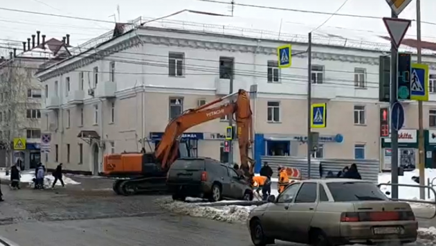 Сегодня, 23 февраля, в центре Кургана водитель внедорожника провалился в яму. Всё произошло на пересечении улиц Ленина и Мяготина.
