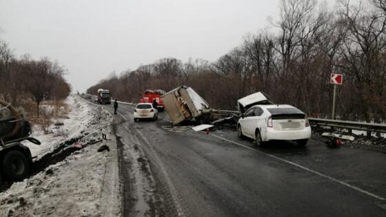По предварительным данным, не справившись с управлением, водитель грузовика марки Toyota Dyna выехал на полосу встречного движения, где произошло столкновение с транспортными средствами Mitsubishi Fuso и Toyota Prius.