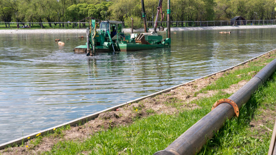 Заммэра отметил, что берега пруда уже полностью укрепили. Для этого специалисты закрыли бетонные плиты защитным слоем из крупной гальки, смешанной с цементно-песчаным раствором. Благодаря этому береговая полоса стала прочнее и приобрела новые очертания, оставшись при этом откосной. По словам Петра Бирюкова, продолжаются работы по очистке ложа от иловых накоплений и грунта. Удалено более 18 тыс. куб. м ила, что составляет примерно 65% от общего объема. Очистку выполняют без полного спуска воды при помощи специального технического судна. После извлечения массу обезвоживают на мобильном заводе, очищенная вода возвращается обратно в пруд. Такая технология сохраняет привычные условия обитания для рыб, микроорганизмов и растений.
