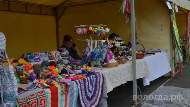 Так, вдоль главной площади города развернулись палатки с продукцией. Это изделия из стекла и керамики, платья и платки, тульские пряники, одежда из льна и многое другое. Наталья Воронцова приехала в Вологду из Тотемнсого района и привезла вязаные крючком мягкие игрушки.