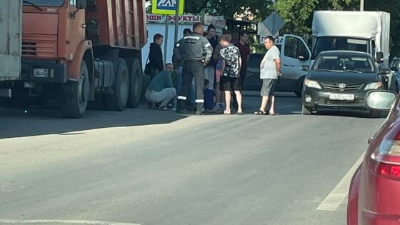 На снимках, сделанных очевидцами, видно ребенка, сидящего в окружении людей на проезжей части в районе пешеходного перехода. Около него стоит иномарка.