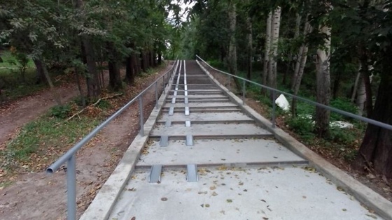 Подрядчик заасфальтировал подходные пути к лестнице, забетонировал ступени, обустроил поручни и пандусы.