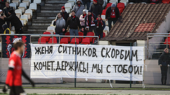 «Женя Ситников, скорбим… Кочет, держись! Мы с тобой», — гласит надпись на баннере. Его фото опубликовали на странице ФК «Амкар» в соцсети «ВКонтакте».