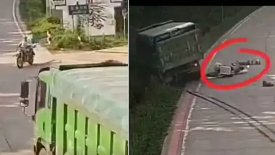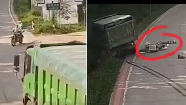 Скутерист пустил под откос самосвал и попал на видео в Китае