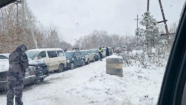Сразу 15 автомобилей столкнулись из-за снега и гололеда на одной из улиц частного сектора в Новосибирске в четверг, 2 ноября.