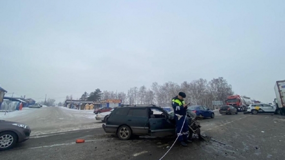 «62-летний водитель автомобиля Toyota Caldina, двигаясь со стороны Красноярска в сторону Енисейска, столкнулся с попутным автомобилем Volkswagen под управлением 57-летней женщины, которая поворачивала налево, а также грузовым автомобилем Hino с 38-летним водителем», – рассказали в МВД. От удара Volkswagen вынесло на встречную полосу. Там он врезался в автобус, за рулем которого находился 57-летний водитель, перевозивший вахтовиков: среди них никто не пострадал. В массовой аварии пострадали три человека – водитель и пассажир Toyota, а также шофер Volkswagen. Движение на данном участке производится по одной полосе. Ситуацию регулирует экипаж ДПС. Ранее «ФедералПресс» про другую аварию, случившуюся в Красноярске: одновременно столкнулись 12 автомобилей. Фото: пресс-служба полиции Красноярского края