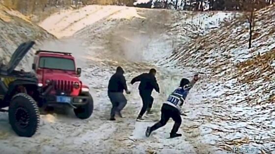 Водитель-сорвиголова на красном джипе попал на видео, когда пытался покорить заснеженный холм, но в итоге покатился назад и чуть не наехал на своих друзей, пока они снимали неудавшийся трюк недалеко от города Шэньяна (провинция Ляонин, КНР).