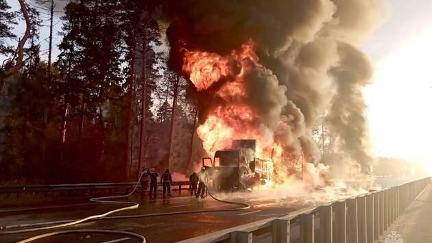ЧП произошло в городском округе Богородский на 55-м километре трассы М-7. На кадрах виден большой пожар, переходящий в столб черного дыма.