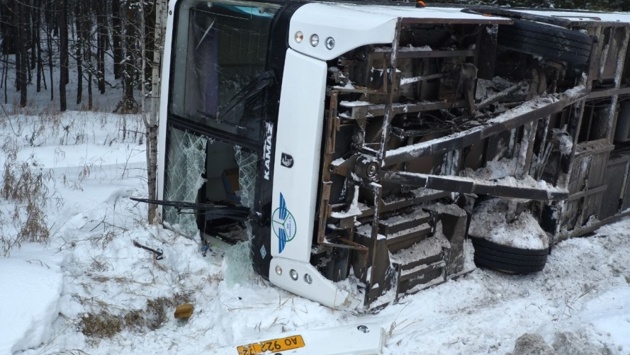 По предварительным данным, на затяжном повороте шофер автобуса КамАЗ зацепил снежный вал, машина съехала в кювет и опрокинулась на бок.