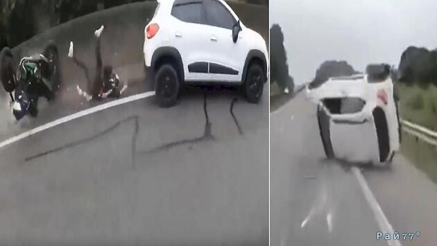 Несколько месяцев назад мотоциклист, прокладывающий маршрут по автомагистрали Родовиа Анхангера (штат Сан-Паулу, Бразилия), запечатлел аварию, произошедшую из-за невменяемого водителя легковушки.