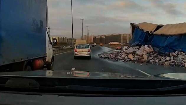 В Санкт-Петербурге перевернулась фура с пивом (видео)