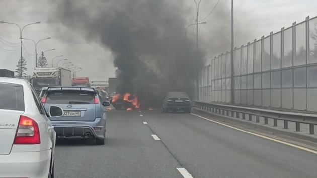Сообщение о ДТП поступило 10 мая в 11:49. На трассе М-10 «Россия» у деревни Ям-Ижора столкнулись три автомобиля, одна из машин загорелась.